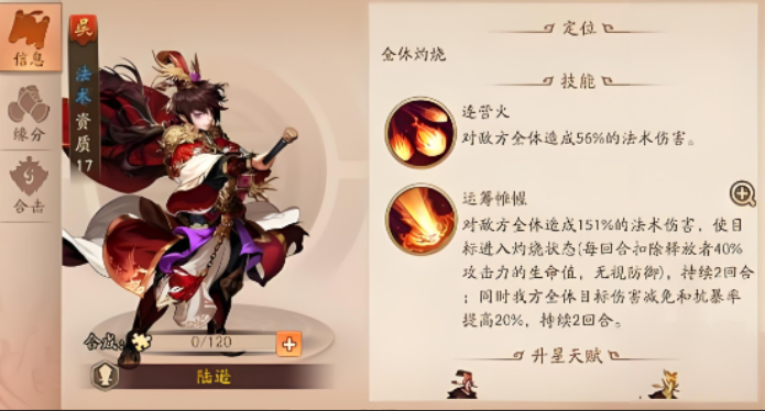 陆逊作为吴国核心法师型武将,凭借灼烧效果和群体伤害能力,在PVE场景中表现尤为突出。他的技能不仅能对敌方全体施加持续灼烧状态,还能提升己方的伤害减免和抗暴率,属于攻守兼备的强力角色。搭配时建议围绕灼烧特性展开,优先选择周瑜、吕蒙等能联动火伤的武将,同时注意阵容的生存能力,比如搭配大乔这类治疗武将。
