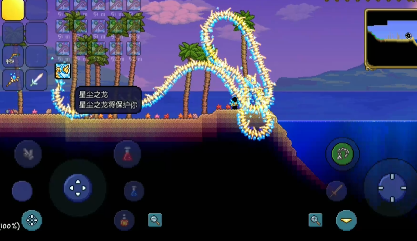 其优先攻击屏幕外的敌人,适合应对大型BOSS而非群体小怪。锁定单一目标时可右键指定,但转换目标可能导致攻击效率下降。建议在对抗月亮领主等后期BOSS时使用,配合防御性饰品确保生存能力。最终成型的20节星尘龙具有极广的攻击范围,但需要整套星尘盔甲和多重召唤增益支持。