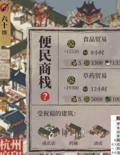 商栈贸易在杭州府中扮演重要角色,玩家可以通过建造商栈并升级工厂来提高贸易效率,贸易路线规划得当能带来更多财富。但需单位时间的赚钱效率可能不如其他方法,除非使用特定人物如李清照或谈允贤,他们的能力能显著提升商栈贸易的收益,使得在睡眠或离线时也能获得可观收入。