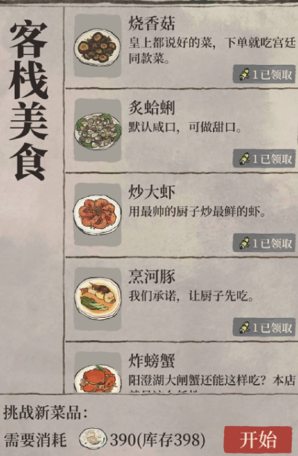 玩家可以通过消耗空盘子来解锁新菜品,具体操作是进入客栈的美食界面,点击挑战新菜品选项,并支付5个空盘子以添加一个新品到菜单中。这一机制鼓励玩家持续制作像烧香菇这样的基础菜品,以换取更多样化的烹饪选项和更高的经济回报。烧香菇本身虽然收益有限,但作为起点,它为玩家提供了熟悉游戏节奏和资源管理的机会,从而为后续更复杂的菜品制作打下基础。玩家应优先保证烧香菇的稳定生产,以高效积累空盘子。