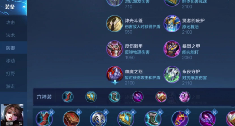 前期开局通常优先购买冷静之靴和噬神之书,鞋子提供15%冷却缩减并提升支援速度,噬神之书则提供10%冷却缩减和25%的法术吸血,解决前期的续航问题。此时再搭配10个怜悯铭文提供的10%冷却缩减,前期就能拥有35%的冷却缩减,技能释放已经非常流畅。中期则补出痛苦面具和极寒风暴,痛苦面具的被动伤害能与貂蝉的短CD技能良好联动,极寒风暴提供20%冷却缩减、高额物理防御和法力值,至此冷却缩减属性刚好达到满额,貂蝉的战斗力迎来质变。