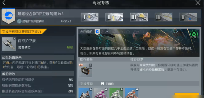 晨曦经合体的驱逐舰驾照是驾驶该阵营驱逐舰的必要条件,驾照分为T1、T2、T3等级别,逐级解锁,考核内容涵盖从基础操控到高阶战术的综合能力。想要驾驶某种舰船,需要获得对应的阵营、舰船和科技1级驾照,每种舰船的驾照考核从T1级别的lv1-lv5开始,考核通过,舰船的加成和武器槽位也会越来越多,T1考核完成后才能进入T2,T2考核完则进入T3。