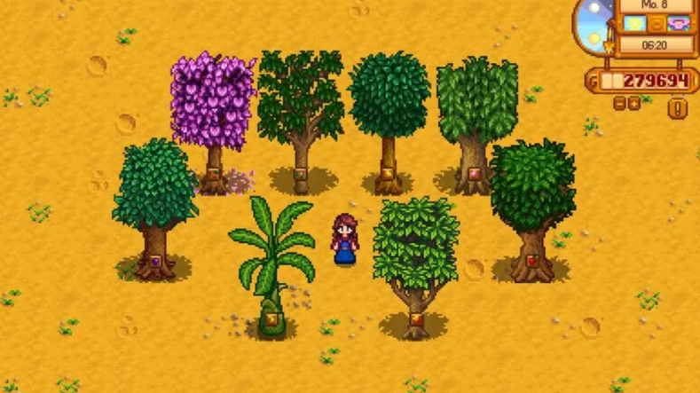 树木的种植位置选择多样,可以结合农场布局和功能需求来规划。农场内的开阔区域,尤其是东侧,被认为是种植各类树木的黄金区域。农场外的部分地区,如煤矿森林、铁路或巴士站附近,也可以种植树木并能正常生长、产出资源,但农场外的树木被砍伐后,其树桩不会再生,需要清理干净才能腾出空间。即使在卡利科沙漠,虽然原生棕榈树不会掉落种子,但玩家依然可以种植枫树、橡树等常规树木。初期规划时,建议将生长周期短的作物与树木区域分开,为树木预留出长期的生长空间,避免频繁移动。合理的位置规划能让树木既成为农场的美丽装饰,又不干扰核心的耕作活动。