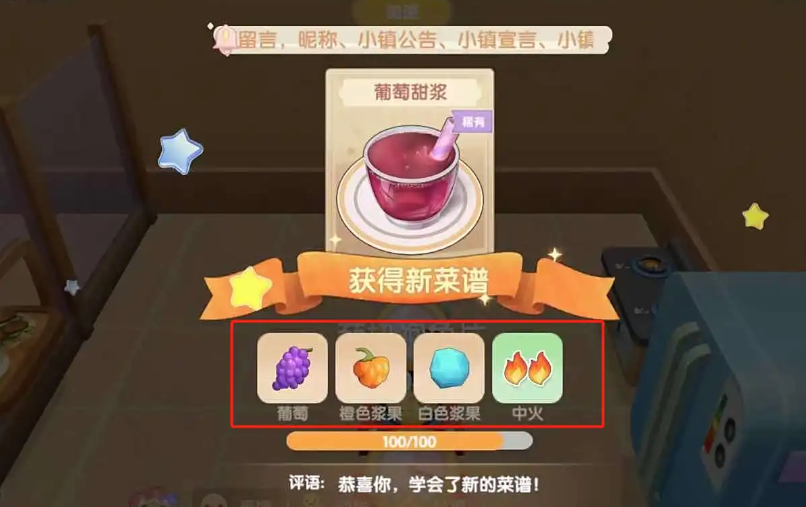 葡萄甜浆是一种稀有度为三星的水果混合饮料,制作时需要准备葡萄3、橙色浆果2和白色浆果2。玩家需达到厨师等级2级并通过研究菜谱解锁该配方,制作时间约为1分钟,餐厅售价为109摩尔豆。这道饮品适合约会场景使用,能为游戏内社交互动增添氛围。