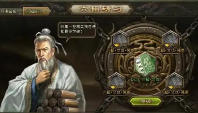 六韬残卷是提升兵书等级的关键道具,咱们可以通过商城购买、活动奖励或者日常任务积累来获取。有了它,就能把低阶兵书合成更高阶的兵书,比如用1本8级兵书、3本5级兵书、400本4级兵书和5本六韬残卷合成1本9级兵书。合成操作很简单,进入六韬界面,把需要的材料拖进去点合成就行。记得留意活动,有时候能白嫖残卷或者打折购买,能省不少金币呢。
