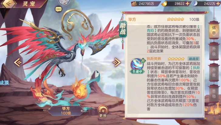 火烧队的灵宠配置推荐主战毕方,助战穷奇和烛龙。毕方是团队输出的核心,穷奇能大幅提升异常状态抗性,烛龙则提供前期生存保障。这套组合能支撑队伍度过前期,并在第三回合后迎来爆发期。灵宠技能与武将技能的联动非常关键,合理搭配能最大化灼烧效果的覆盖率与伤害。