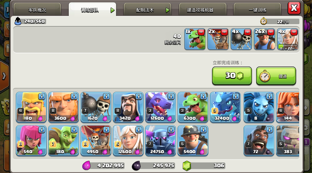 进攻阵容以四王为核心,搭配40个南瓜野蛮人、3个女武神、1个超级蓝胖、1个普通蓝胖,法术携带4个隐身、2个治疗,援兵优选4个女巫、1个法师、10个蝙蝠。开局关键是超级蓝胖的下兵角度,必须在第一个与第二个墓碑中间的城墙位置,确保蓝胖投射直线对准多头地狱塔,依靠第三次普攻精准摧毁它,这是整个进攻的突破口。同时将大守护者调整为空中模式,按蛮王、女王、大守护者、飞盾战神的顺序入场,蛮王优先破墙抗伤,为后续部队开路。