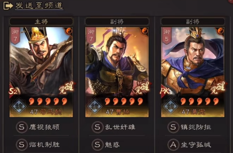 阵容搭配以魏国体系为最优解,太尉盾组合曹操、司马懿、满宠为顶级阵容,曹操提供增伤减伤与续航,司马懿负责持续谋略输出,满宠补充治疗与防御,藤甲兵与魅惑战法可进一步提升队伍坦度与控制能力,面对兵刃队伍优势极大;魏法骑组合曹操、程昱、夏侯惇,依靠曹操的增伤与减伤,配合程昱的禁疗输出与夏侯惇的嘲讽控制,前期开荒与中期打架均有稳定表现;虎卫盾组合曹操、许褚、典韦,激活虎卫神威缘分,提升队伍防御能力,适合对抗骑兵与枪兵队伍,成型难度低且实战稳健。