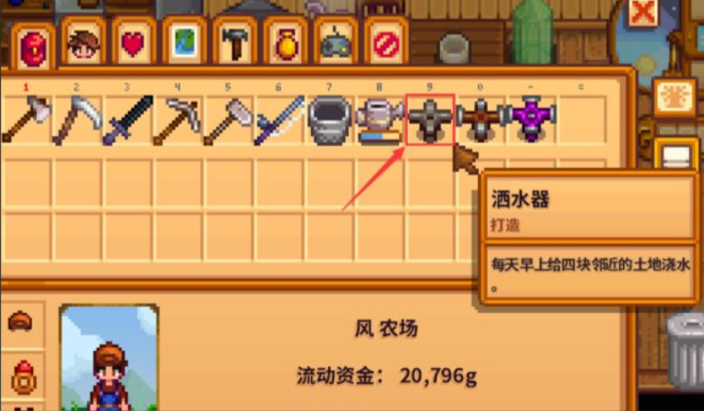 星露谷物语中级洒水器需耕种等级6级解锁,合成材料为1个铁锭、1个金锭、1个精炼石英,在制作界面完成合成,可覆盖以自身为中心的3×3区域内8块耕地,每日清晨自动浇水。
