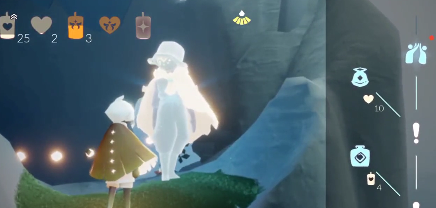 进入霞谷地图后,可选择滑行赛道或飞行赛道快速抵达终点神殿,两条路线终点相通,优先选择飞行赛道能节省赶路时间,抵达神殿大厅后,中央神坛光圈与两侧石碑无需互动,直接聚焦神殿正门即可。正门为高大石质结构,顶部有明显的凹陷卡位,这是翻越的核心点位,起飞时保持垂直方向,避免左右偏移被气流带偏,光翼能量不足时可在神殿内蹭云补充,确保一次攀升到位,站在凹陷处后向前轻飞,就能穿过地图边界进入外侧空域。