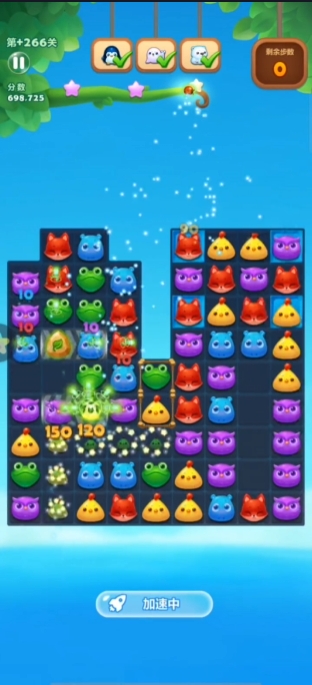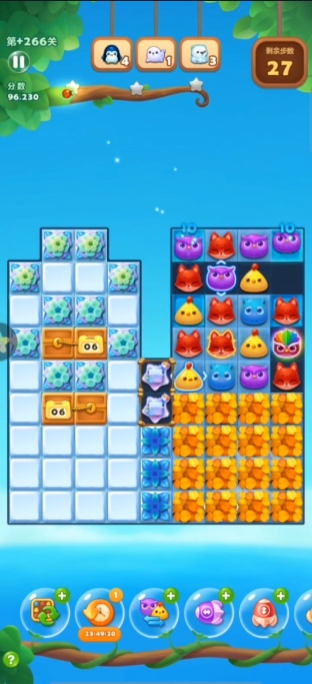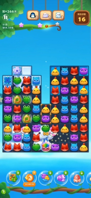 推进过程中时刻关注藤条球状态,若不慎触发,立即用附近特效快速清除蔓延的藤条,防止其封锁动物掉落路径。中间阶段棋盘空间逐步扩大,继续在中下部合成特效,保持特效衔接,不要盲目普通消除,每一步都围绕清理冰块和银币展开。当剩余少量冰块与银币时,不要分散火力,集中特效与消除操作在剩余目标区域,利用最后几步的连锁消除完成收尾,确保在步数耗尽前达成所有通关目标。