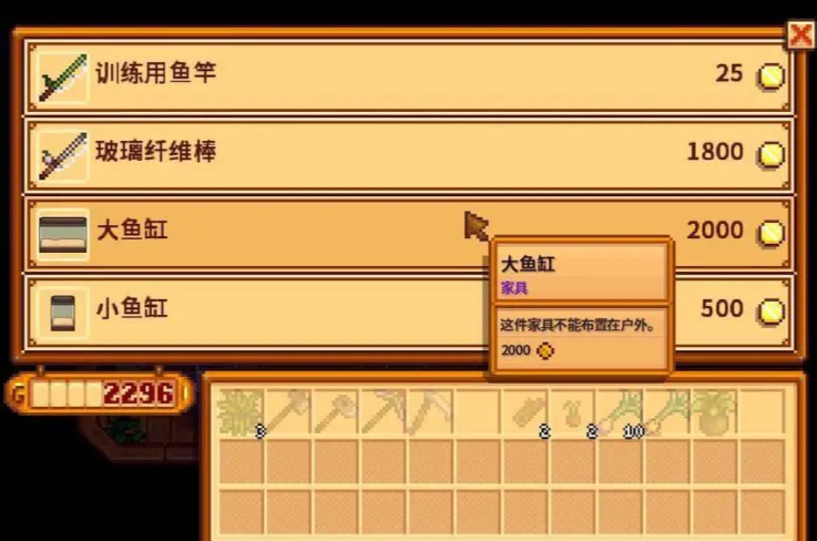 鱼竿的升级机制并非通过直接改造原有鱼竿实现,而是需要玩家通过提升钓鱼技能等级后购买更高阶的新鱼竿来替代旧装备。游戏中共有三种鱼竿可供解锁:初始的竹鱼竿(Bamboo Rod)、中期的玻璃纤维鱼竿(Fiberglass Rod)以及后期的铱金鱼竿(Iridium Rod)。每种鱼竿的功能差异显著,高阶鱼竿能支持鱼饵、浮漂等配件安装,直接影响钓鱼效率和收益。